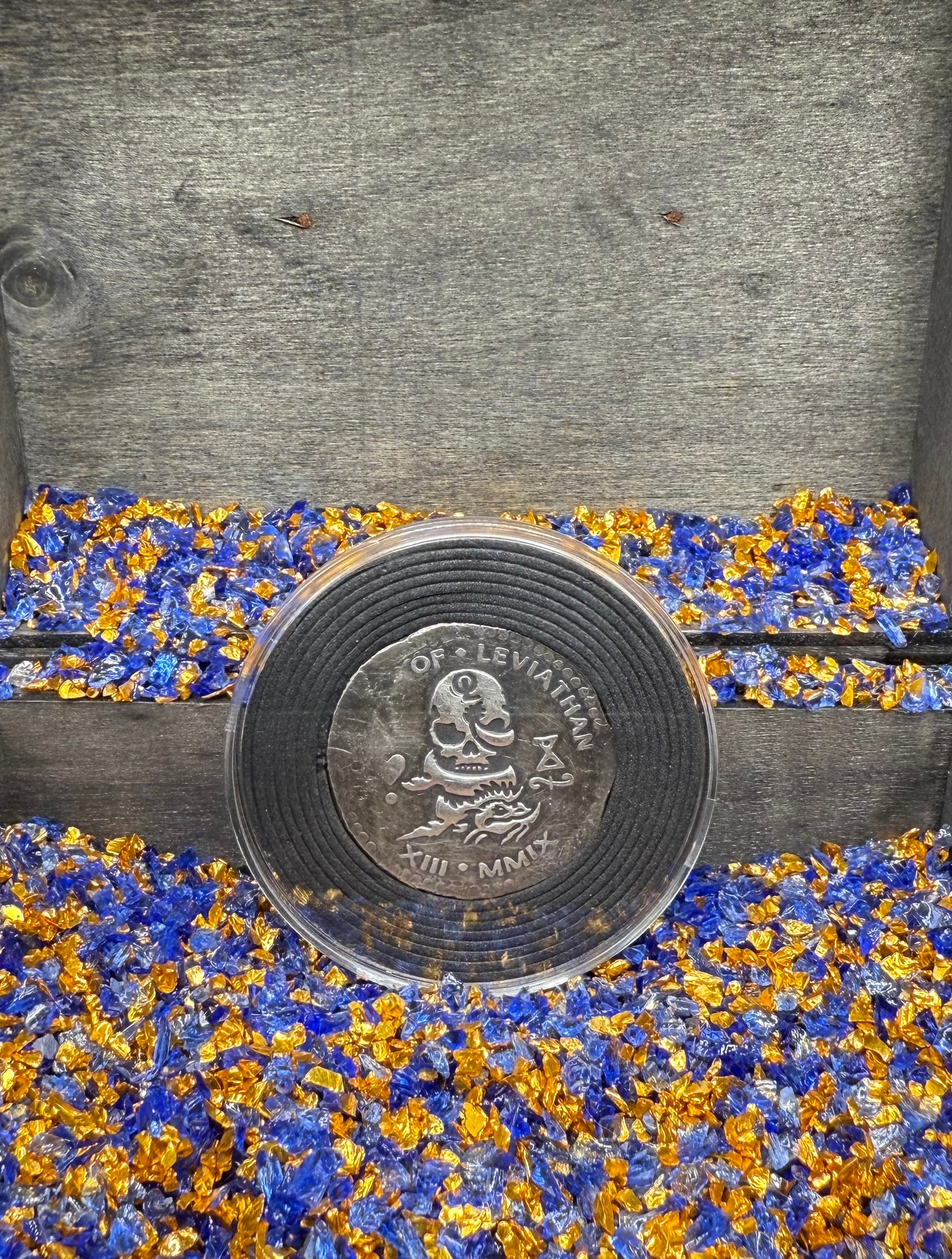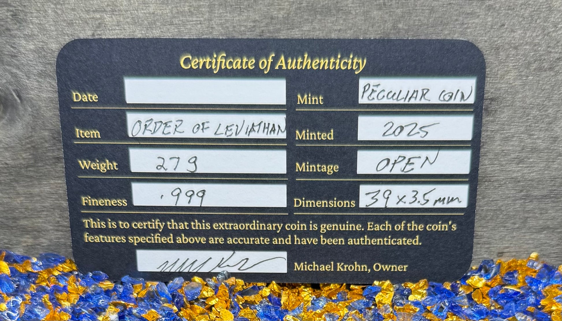 This beautiful pirate treasure minted in 2025 by Peculiar Coins is inspired by the Order of the Leviathan, a private group of recognized pirates. This piece is made using 27 grams of .999 fine silver.