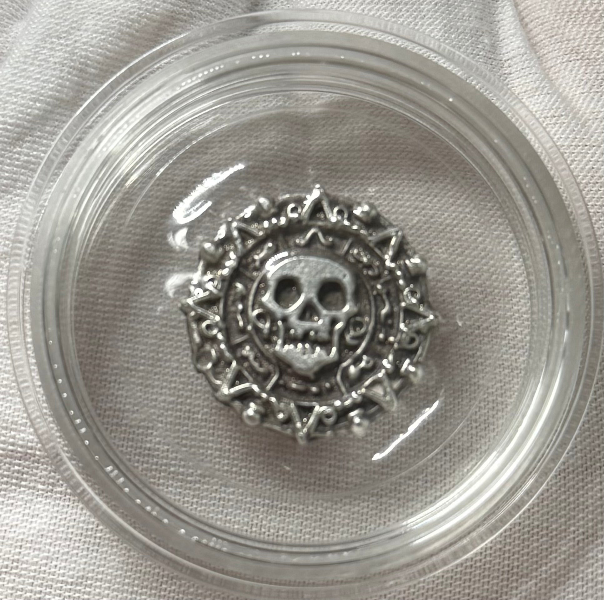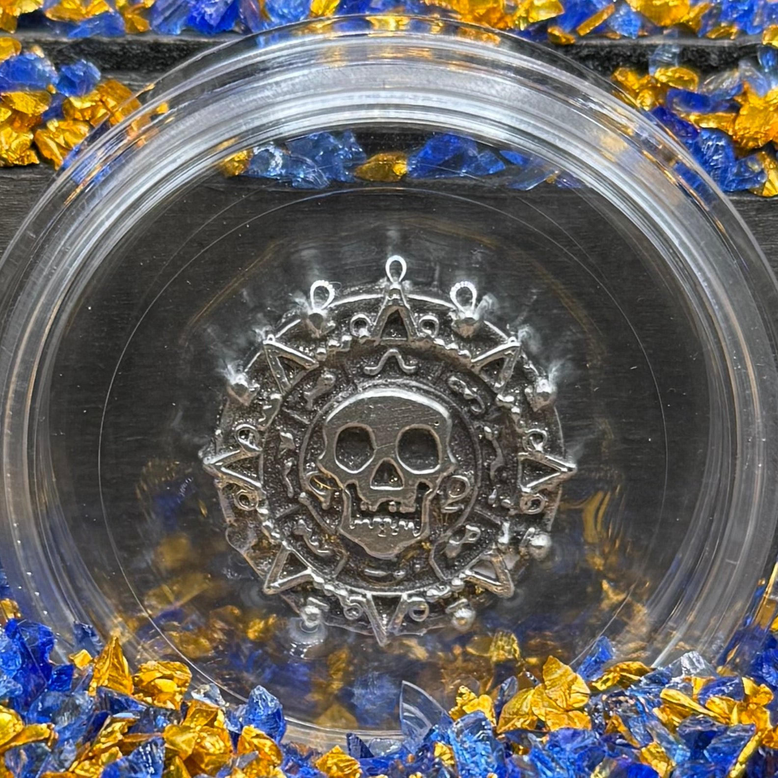 'Aztec Silver Doubloon' Pirate Treasure Hand Crafted by Peculiar Coins .5 Troy Ounce .999 Fine Silver Round Double Sided Skull Antique, Wood Treasure Chest, Capsule & COA Mint Condition