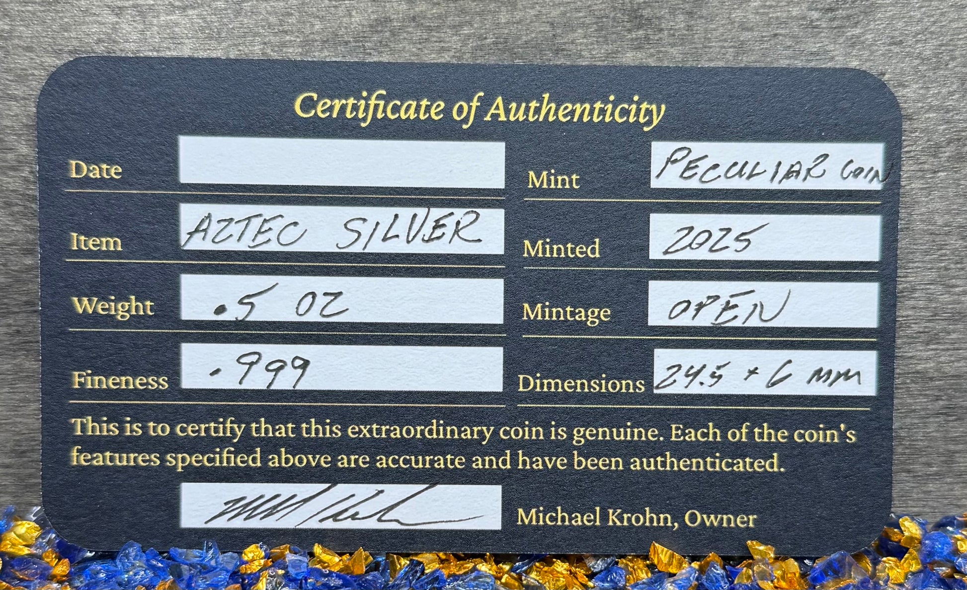This beautiful pirate treasure 'Aztec Silver Doubloon' is a double sided skull design carefully handcrafted in 2025 by Peculiar Coins using .5 Troy Ounces of pure silver (.999). This peculiar pirate treasure is a popular choice for collectors and pirate enthusiasts.