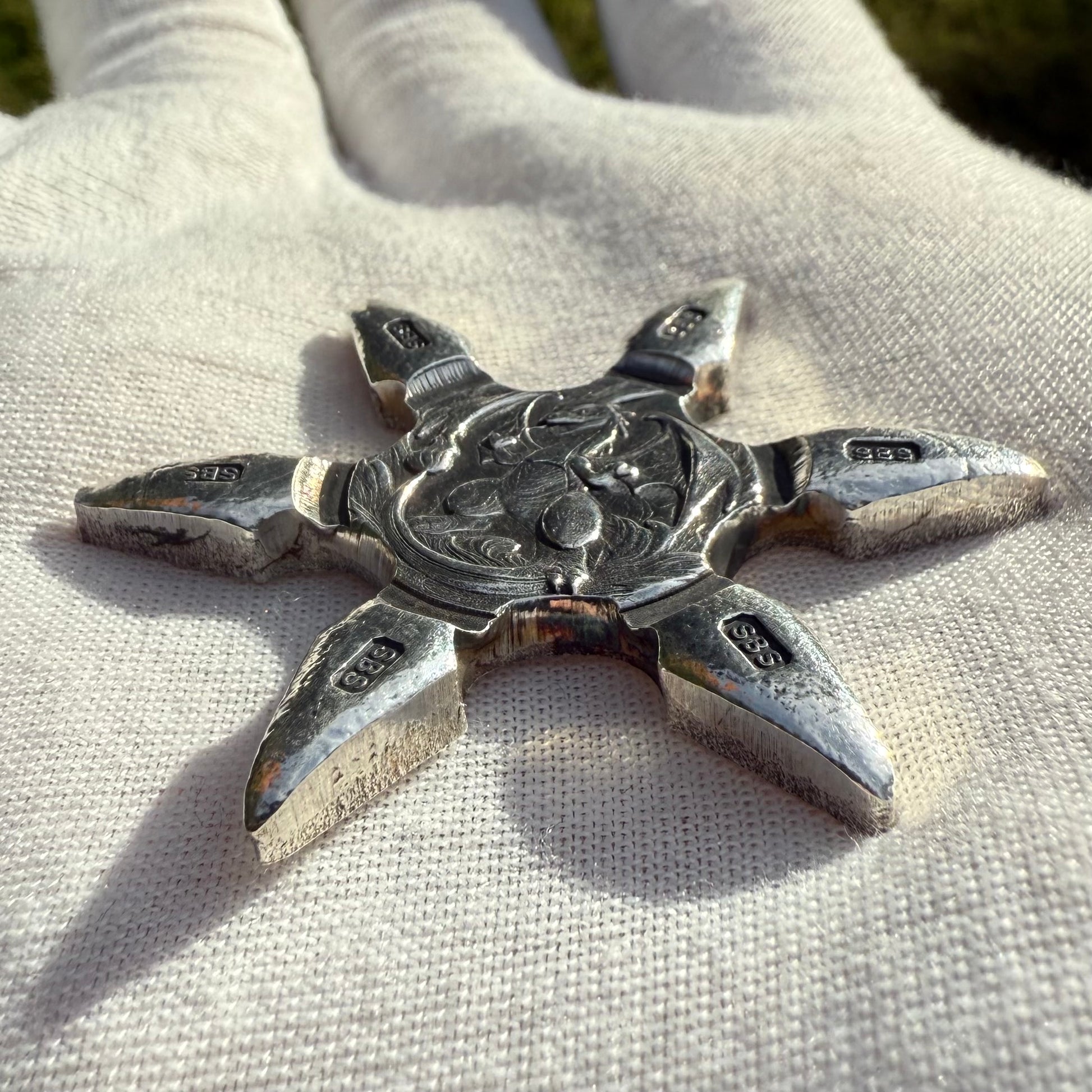 This limited edition Pokémon 'Charizard Star' is hand crafted in Northern England by St Bee's Silver using 1.08 ounces of .999 pure silver bullion. This beautiful star shaped piece of art, inspired by Pokémon, and makes a fantastic addition to any portfolio. The workmanship and detail is exquisite. Approximate dimensions are 53.4 mm x 4.8 mm.