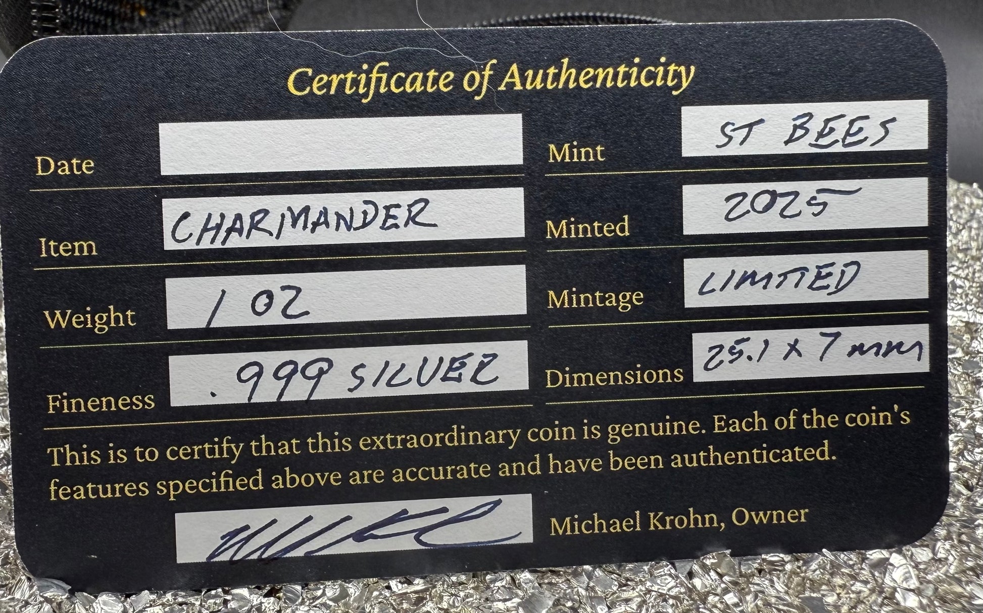 Pokémon 'Charmander' 1 oz .999 Pure Silver Round Hand Crafted by St Bee's in England, Frosted Finish, Includes Poké Ball & COA, Mint Condition Limited Edition