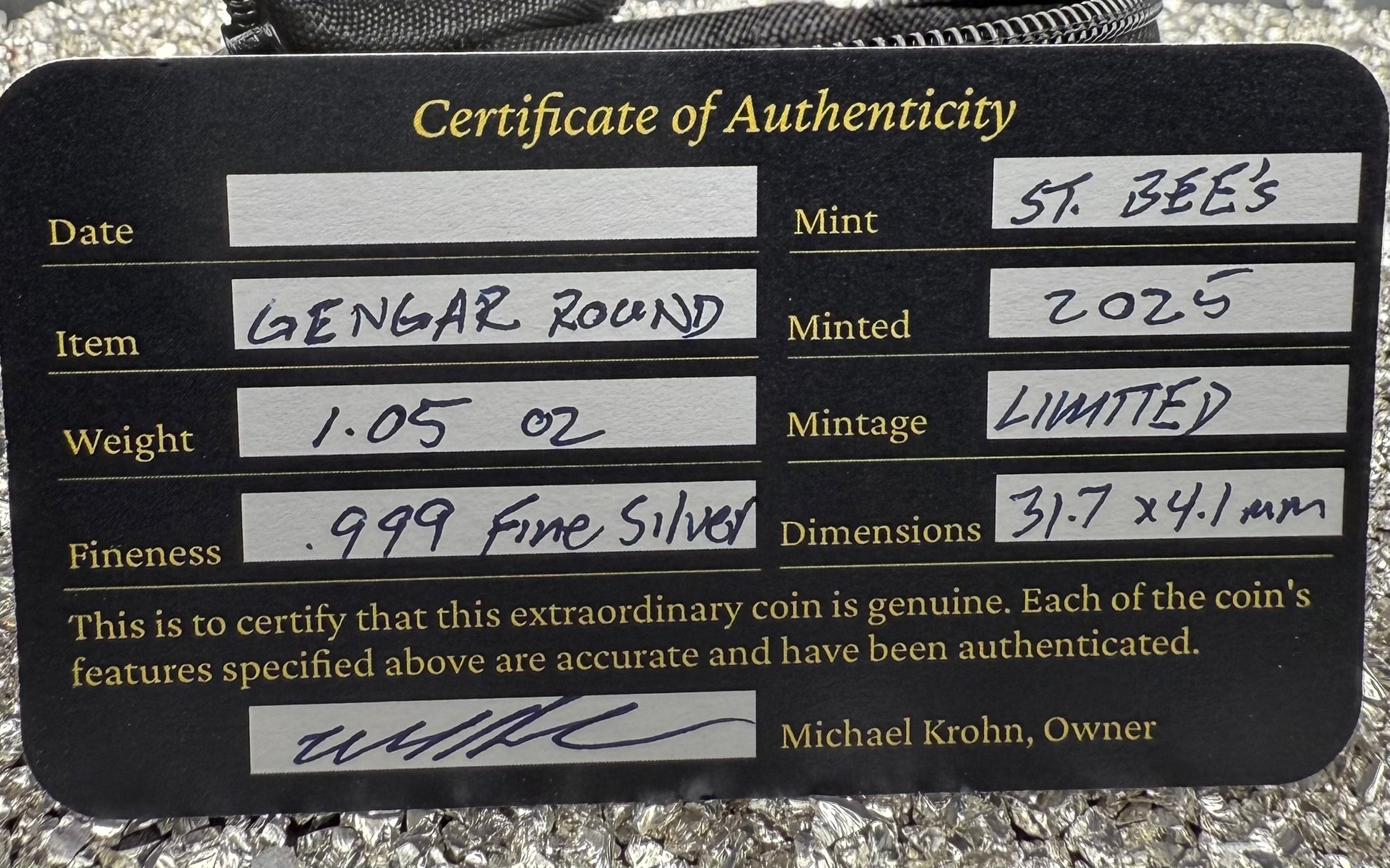 Pokémon ' Gengar' 1.05 oz .999 Pure Silver Round Hand Crafted by St Bee's in England, Satin Finish, Includes Poké Ball & COA, Mint Condition Limited Edition