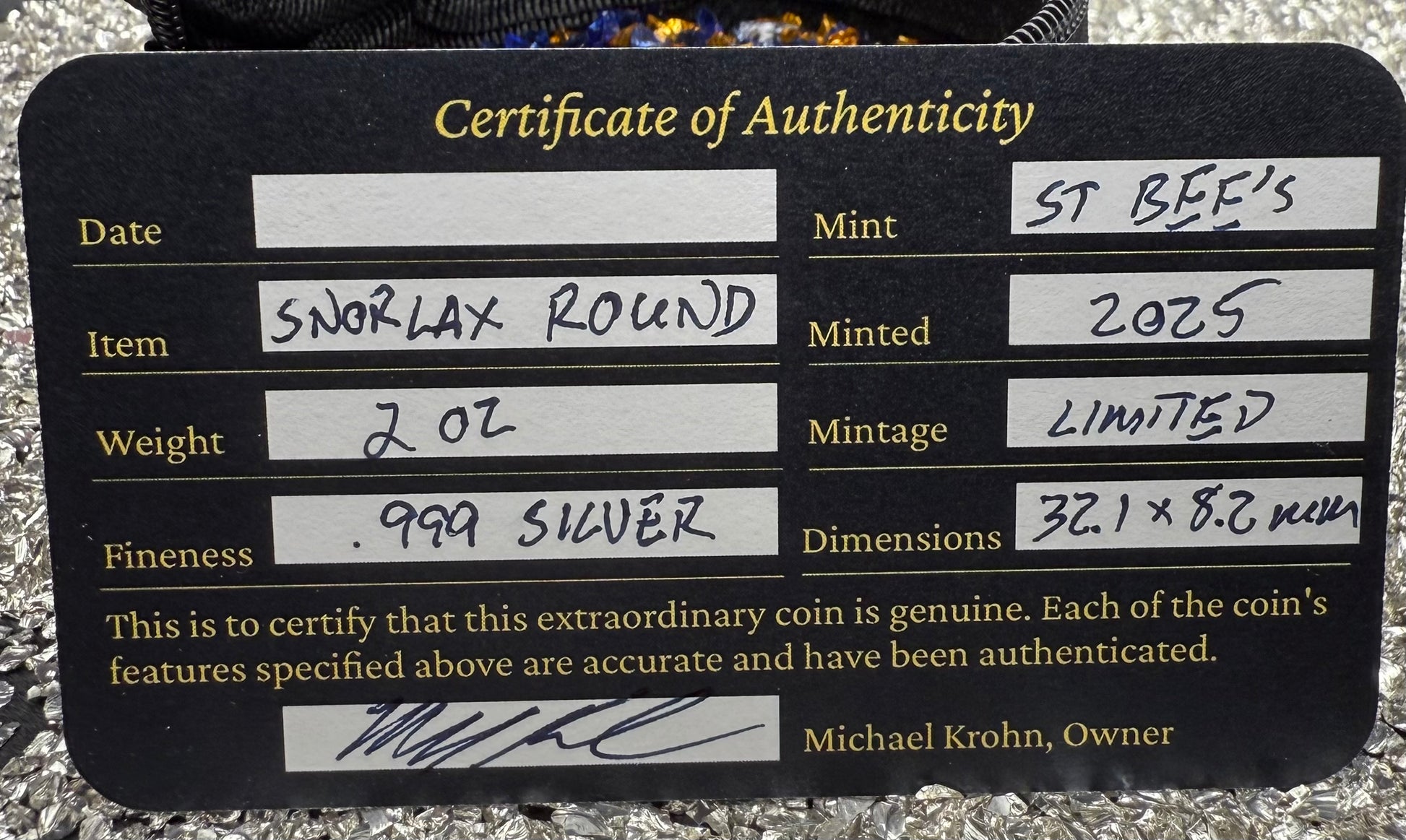 Pokémon 'Snorlax' 2 oz .999 Pure Silver Round Hand Crafted by St Bee's in England, Satin Finish, Includes Poké Ball & COA, Mint Condition, Limited Edition