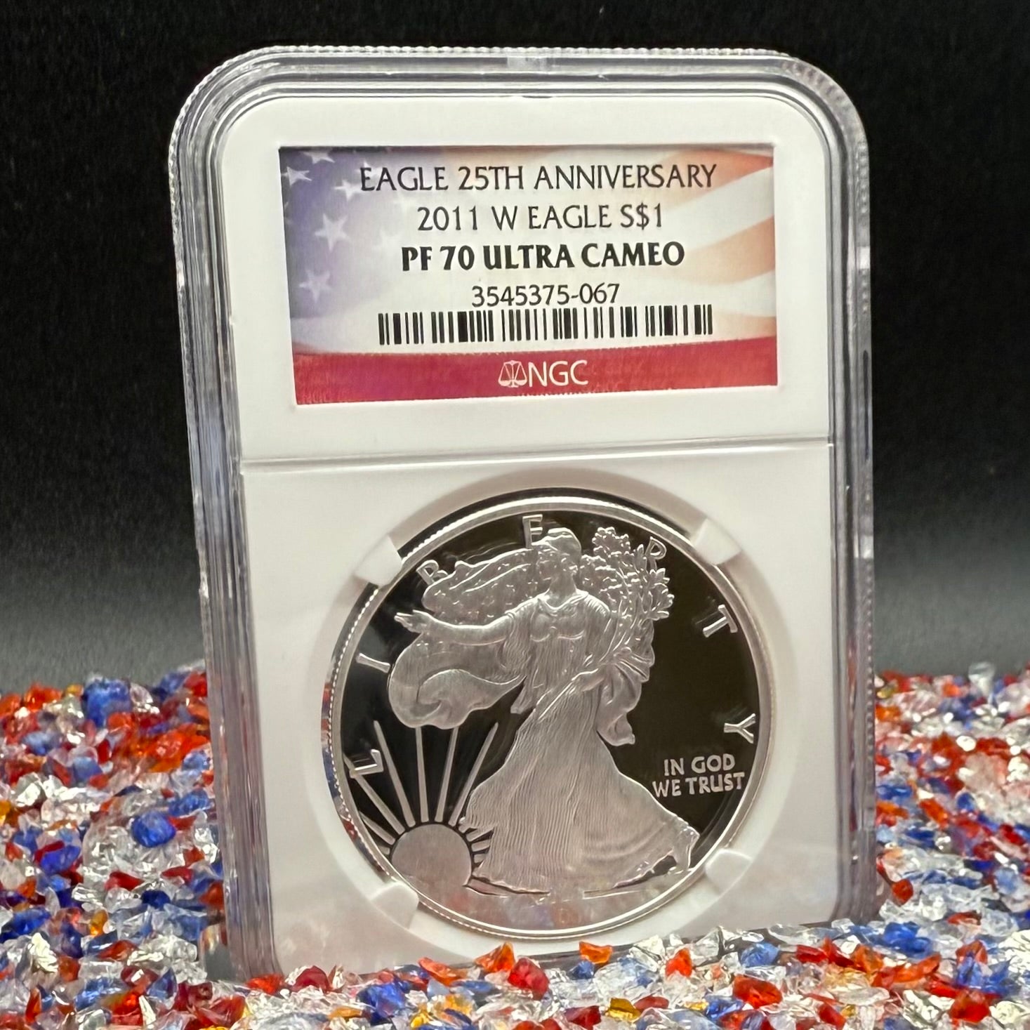 This rare certified 2011 West Point PF70UC American Silver Eagle coin was struck perfectly and received a stunning highest grade by the NGC. This simple yet elegant piece is in mint condition with a proof finish enshrouded in an American Flag label. Low mintage of 9,295 makes this an excellent addition to any collection.