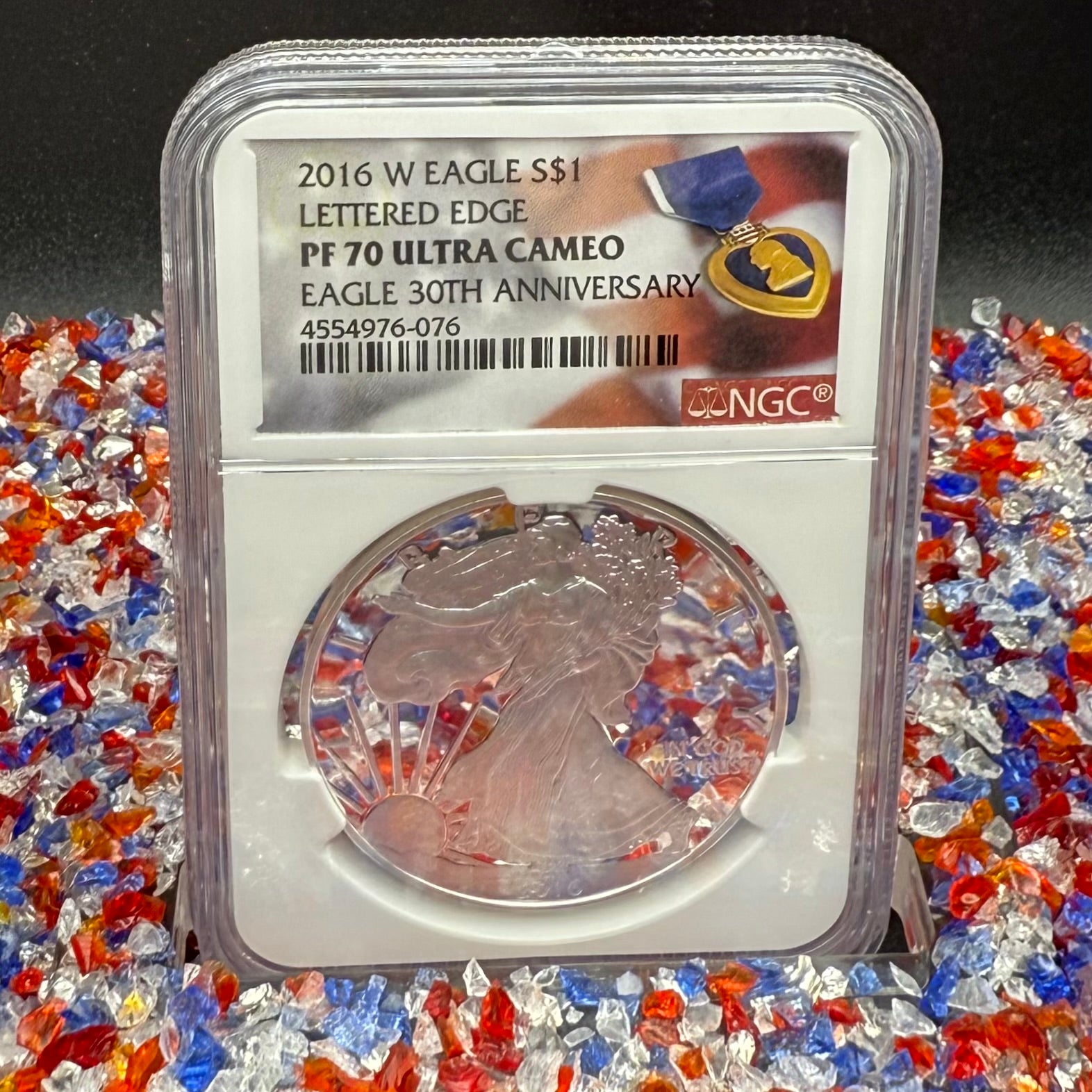 Proof 2016 (W) $1 American Silver Eagle NGC PF70UC Purple Heart Lettered Edge 30th Anniversary Label White Holder