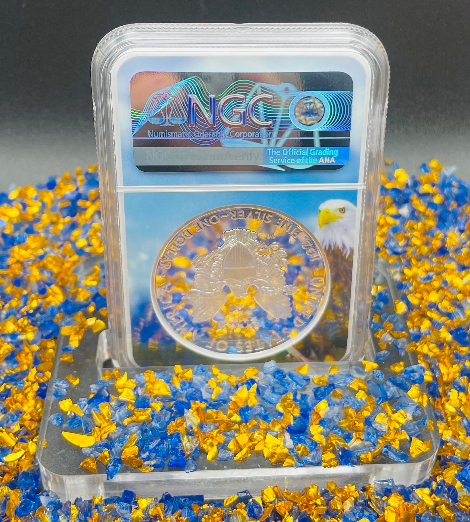 This rare certified 2018 West Point PF70 American Silver Eagle coin was struck perfectly and received a stunning highest grade by the NGC. This simple yet elegant piece is in mint condition with a proof finish wrapped in a rare American Eagle Holder.