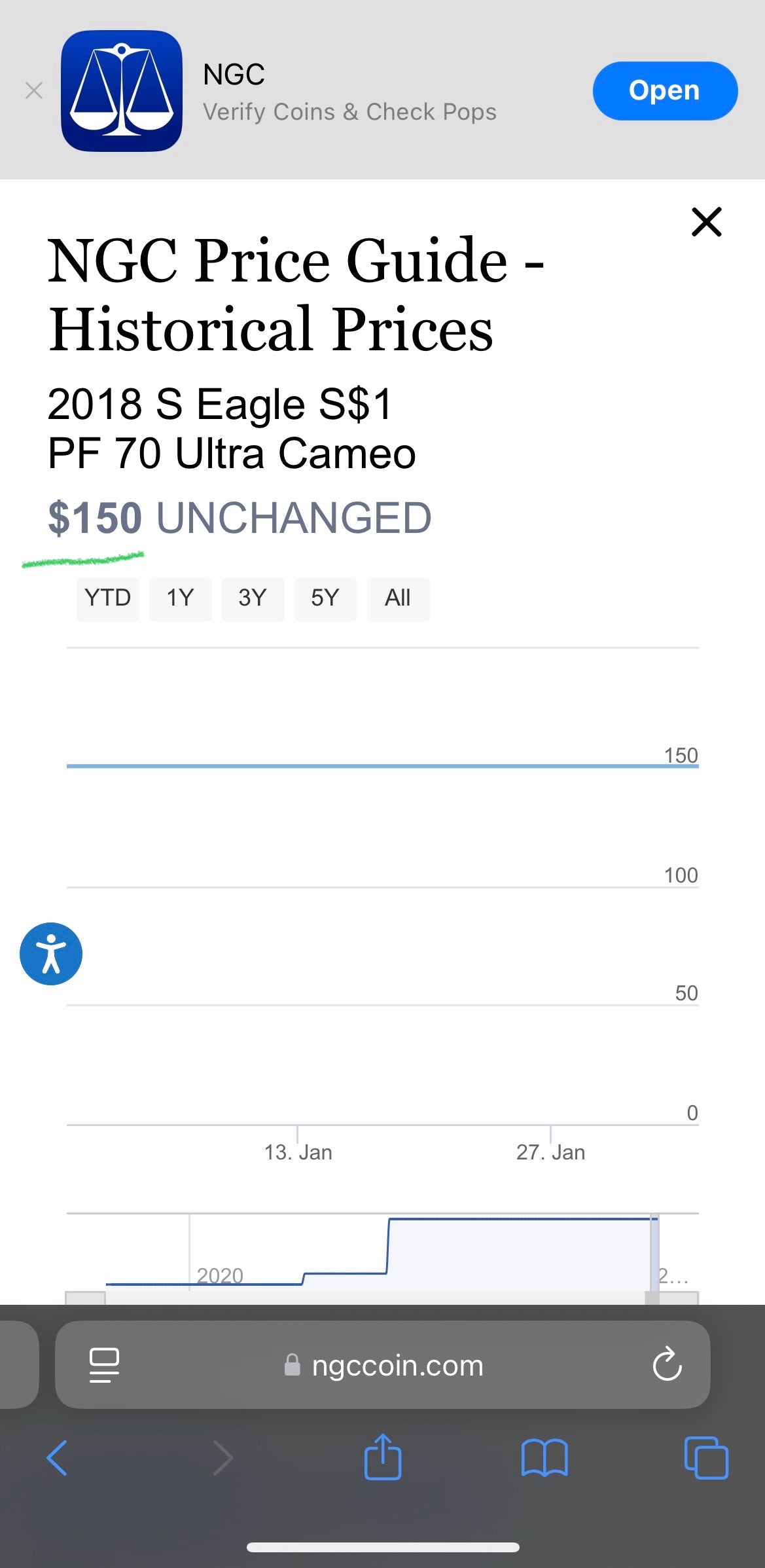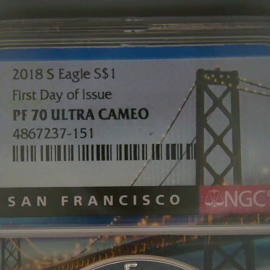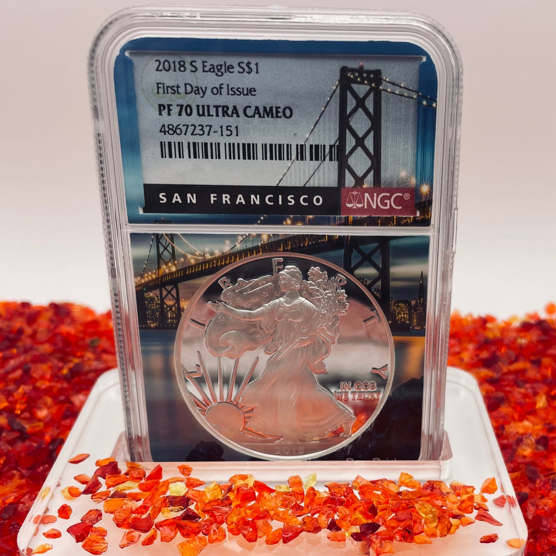 This rare certified 2018 San Francisco PF70 American Silver Eagle coin was struck perfectly and received a stunning highest grade by the NGC. This simple yet elegant piece is in near mint condition (contact marks on holder) with a proof finish encased in a golden Gate Bridge holder.