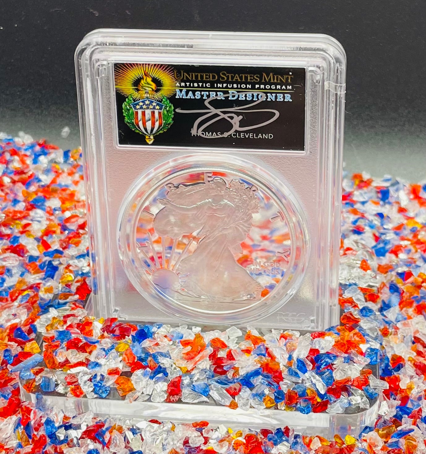 This exceptional certified 2020 West Point PR70DCAM American Silver Eagle coin was struck perfectly and received a stunning highest grade by the PCGS. This simple yet elegant piece is in very good condition (contact marks on holder,1 spot at obverse) with a proof finish signed by Master Designer Thomas S. Cleveland.