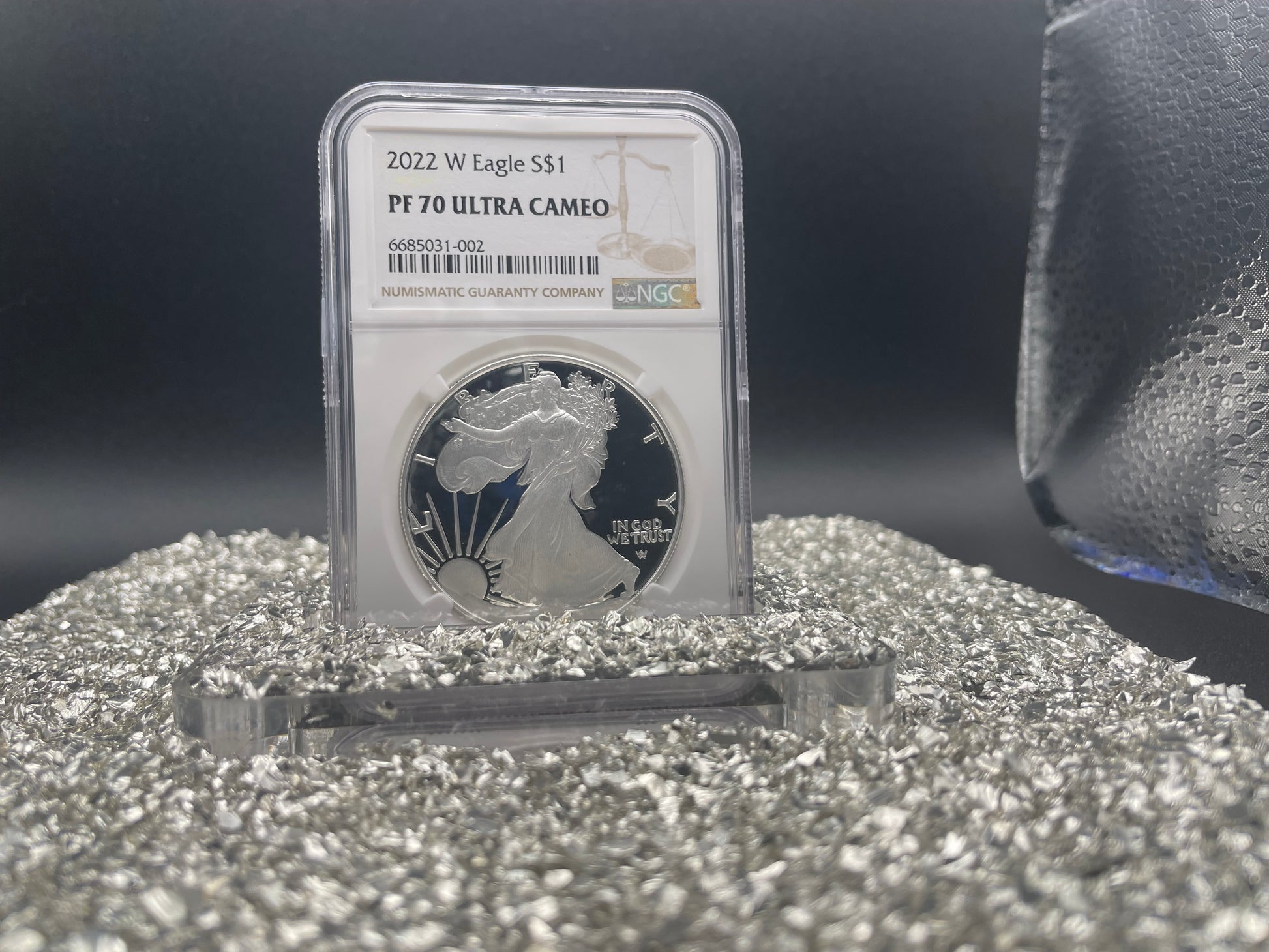 This rare certified 2022 West Point PF70 American Silver Eagle coin was struck perfectly and received a stunning highest grade by the NGC. This simple yet elegant piece is in near mint condition (light contact marks on holder) with a proof finish wrapped in a classic brown label. Low mintage of 5,895 makes this an excellent addition to any collection.