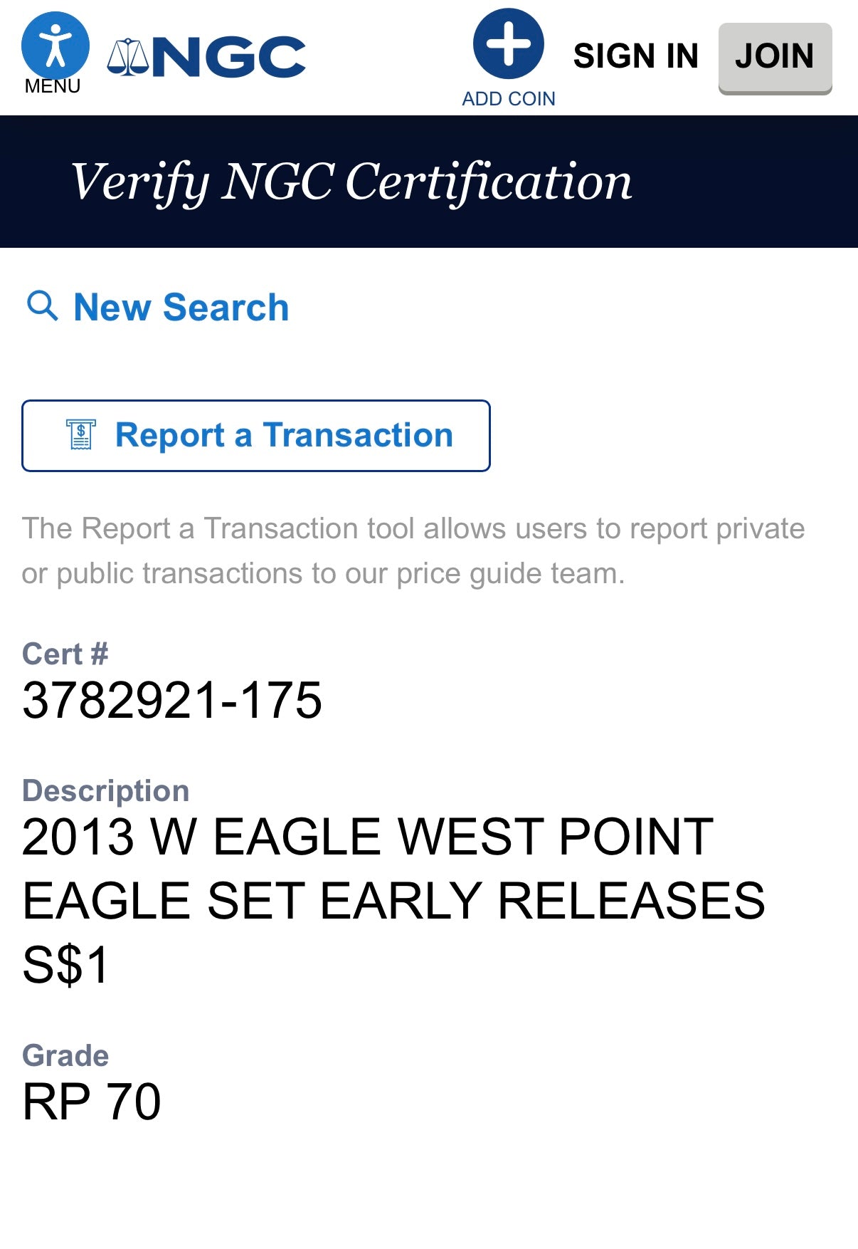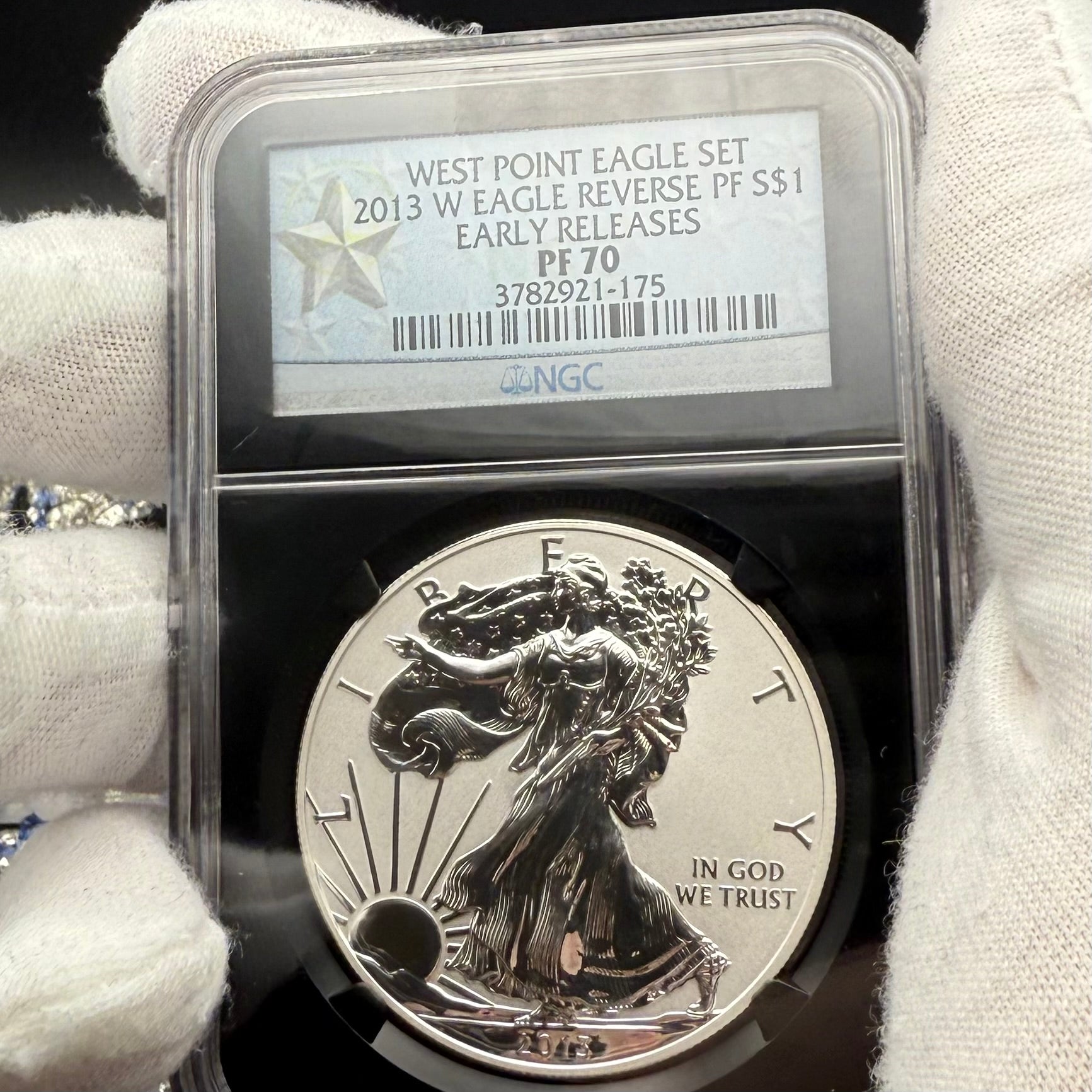 This rare coin set consists of two certified 2013 West Point PF70UC American Silver Eagles struck nearly perfectly and received a stunning highest grade by the NGC. This simple yet elegant set is in excellent condition with a reverse proof and enhanced finish encased in a beautiful black core with a West Point Silver Star Label.