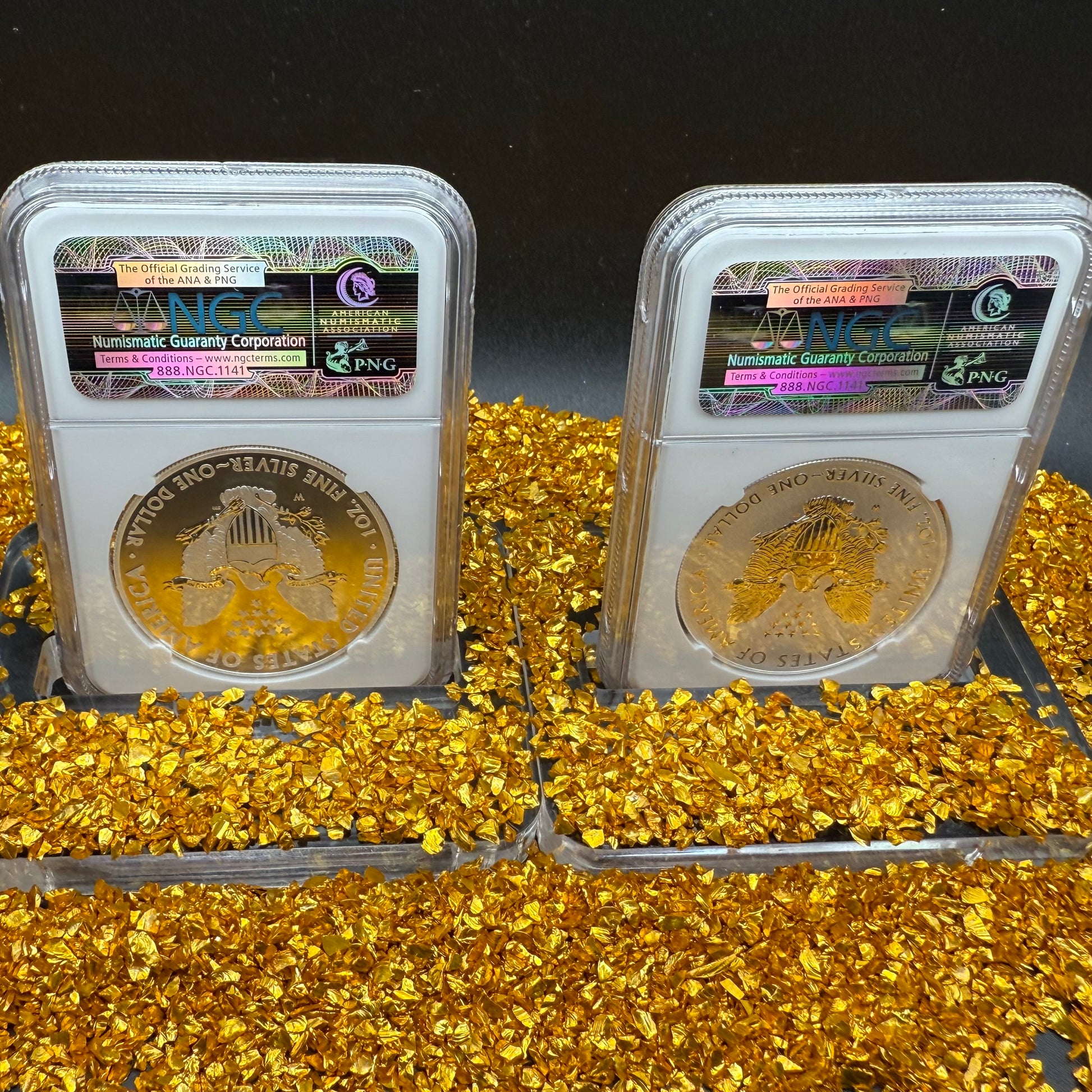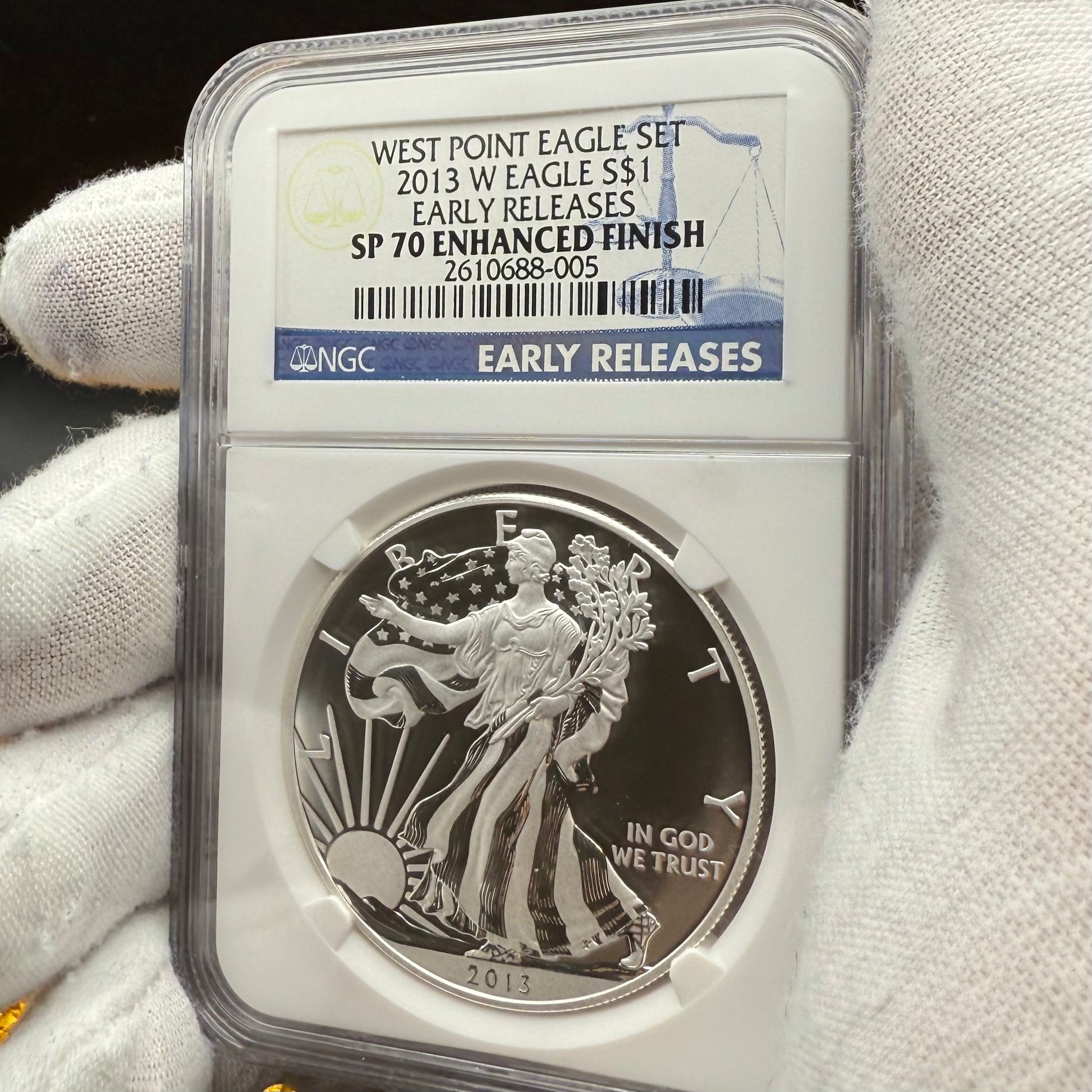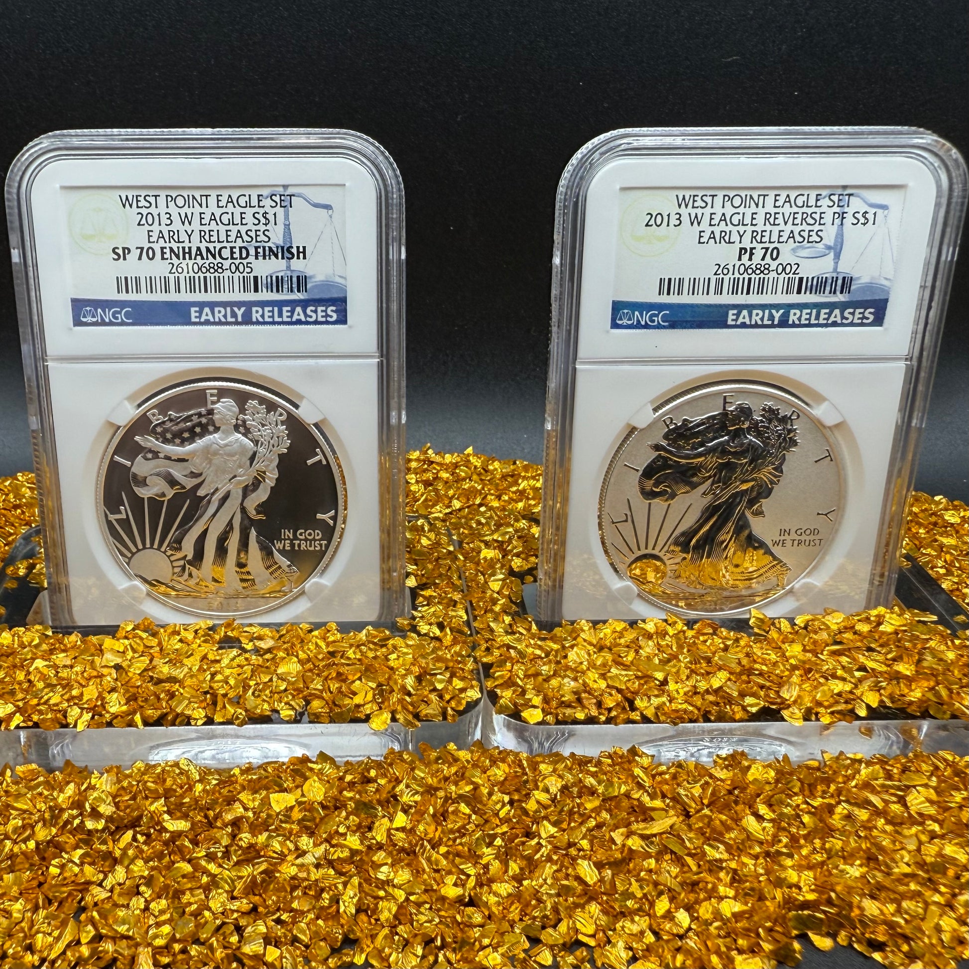 This rare coin set consists of two certified 2013 West Point PF70UC Early Releases American Silver Eagles struck perfectly and received a stunning highest grade by the NGC. This simple yet elegant set is in mint condition with a reverse proof and enhanced finish encased in a beautiful white core with a rare Classic Blue Label.