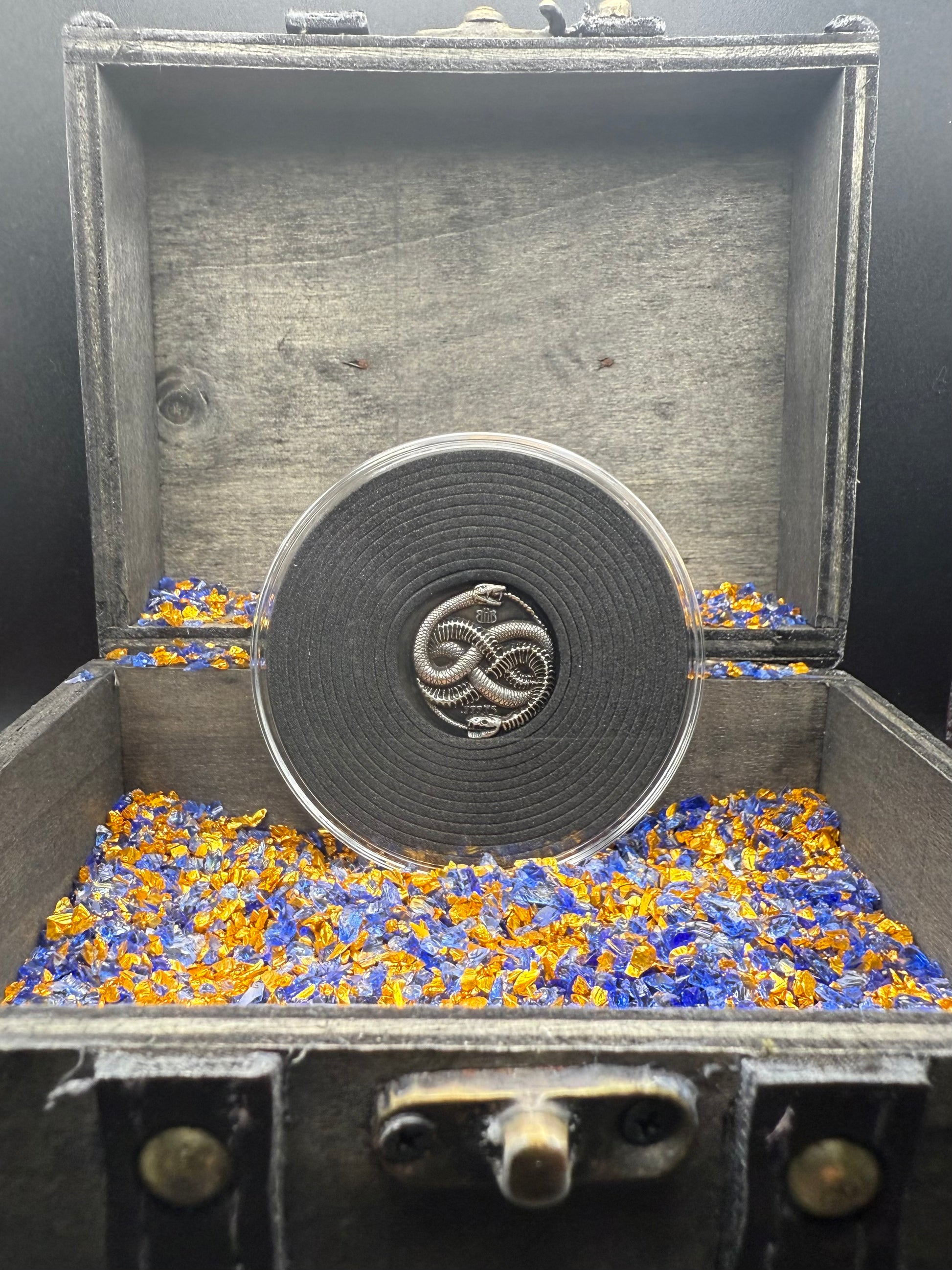 Snake Cycle of Life - Hand Crafted by Black Hand Bullion 1 oz .999 Fine Silver Round Antique Finish Includes Wood Treasure Chest, Capsule & COA Limited Edition